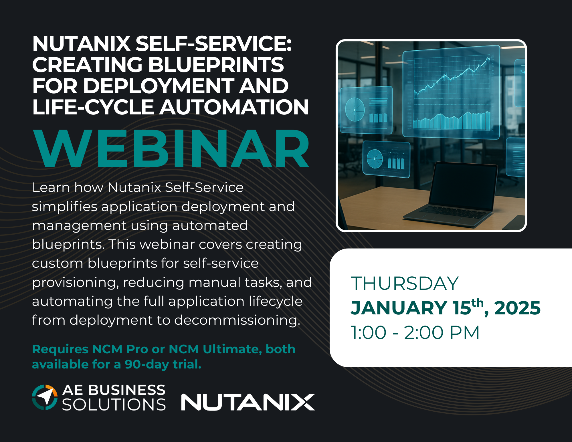 Learn how to leverage Nutanix Self-Service to streamline application deployment and management through automated blueprints. This webinar will walk you through creating custom blueprints that enable self-service provisioning, reduce manual configuration tasks, and automate the entire application lifecycle, from initial deployment through updates and decommissioning. Please Note: This functionality requires NCM Pro or NCM Ultimate - both of which you can try for 90 days if you don't already own it.